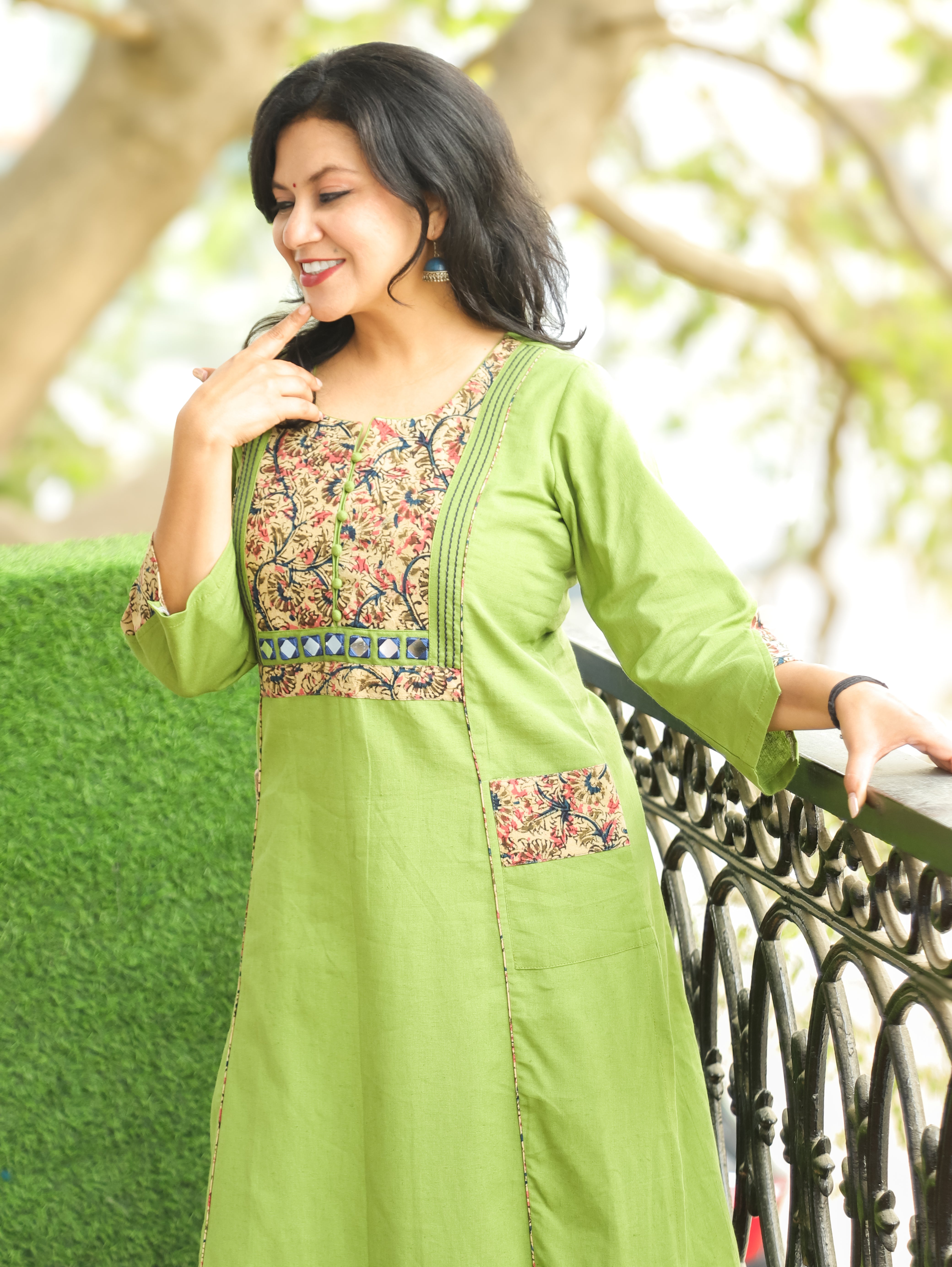 Vaishali Grass Green Potli Button with Mirror Kalamkari Yoke Panel Cotton Kurti